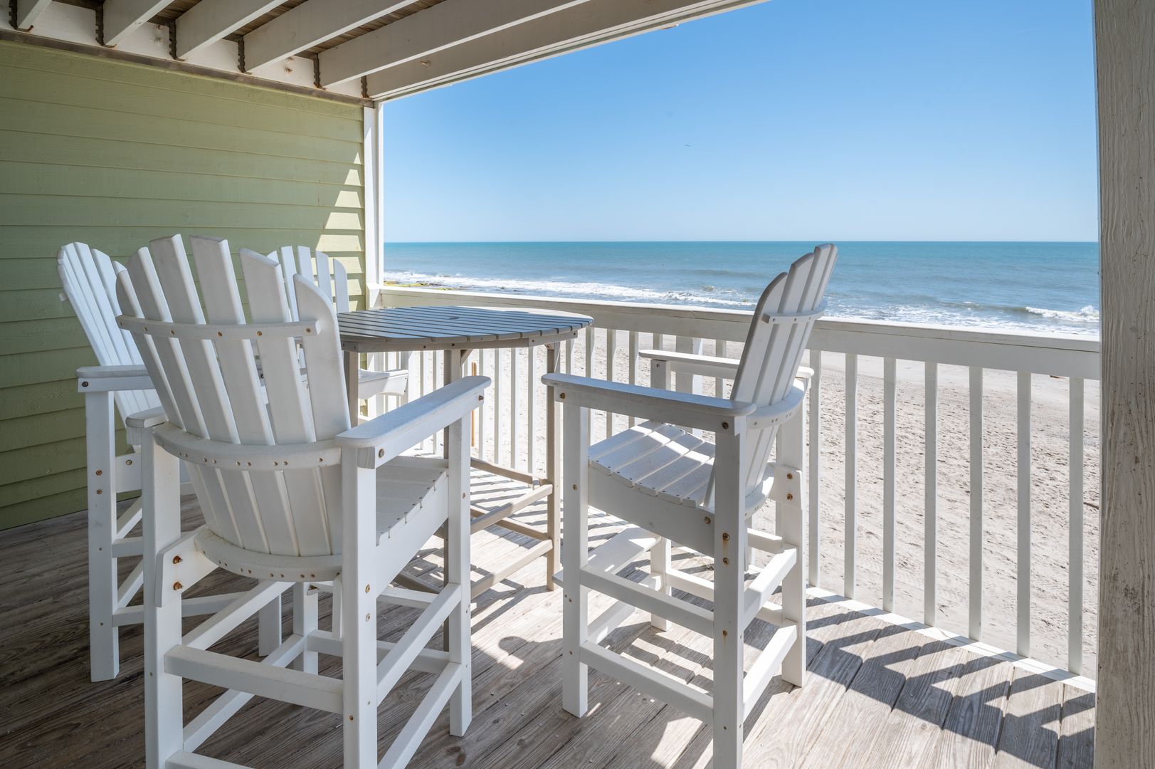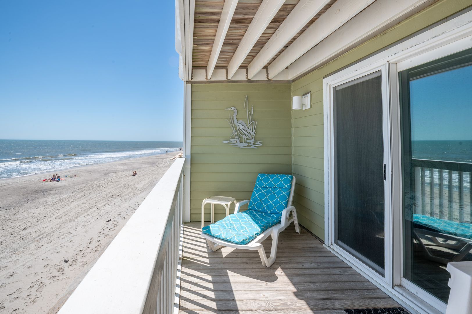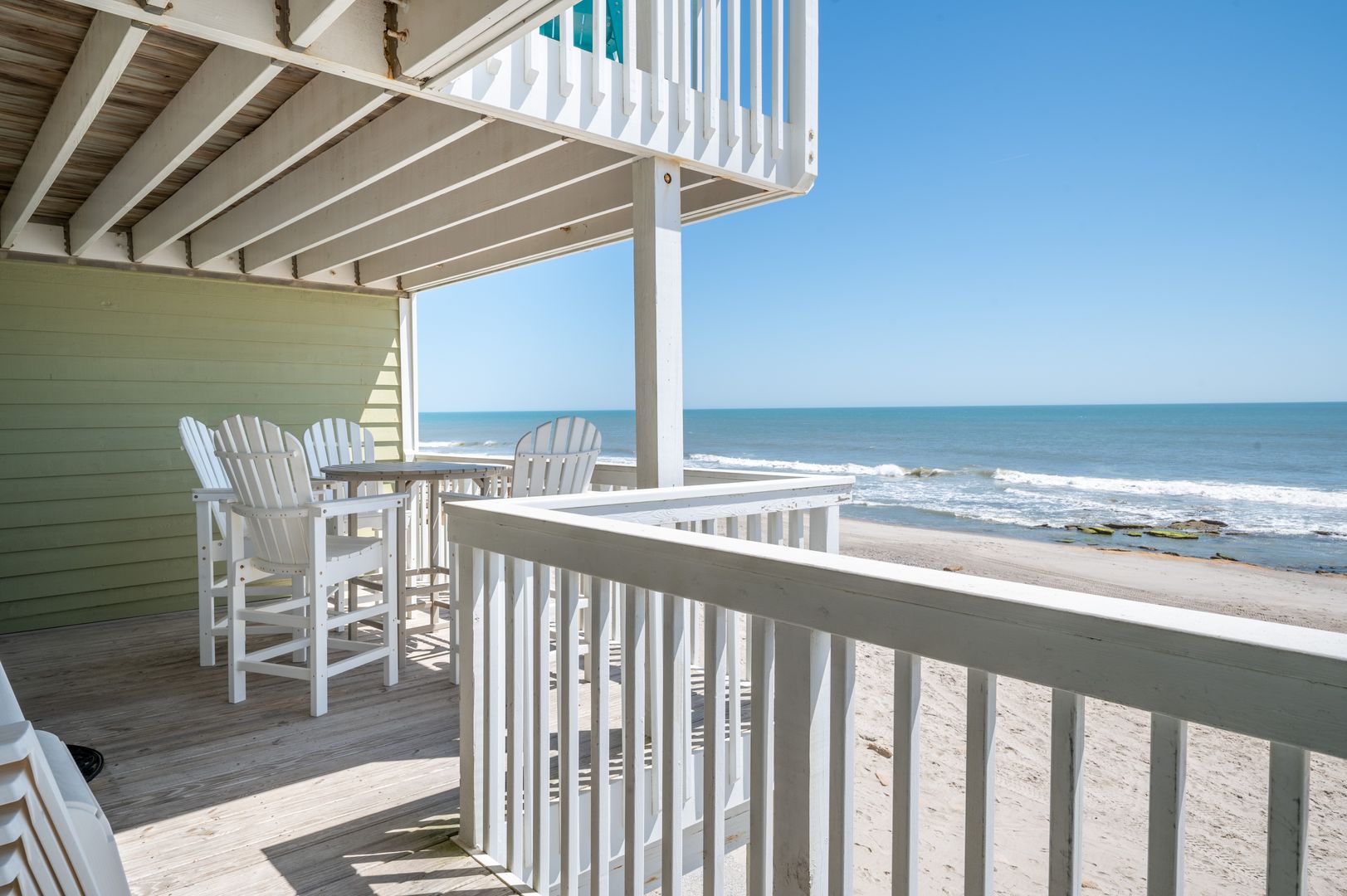 Connect intimately with the ocean from either your living room or primary bedroom suite. The Sandbox is the true meaning of oceanfront, with sweeping views from the windows and oceanfront balconies that have you hanging out over the beach! Our first-floor condo with elevator hovers over the spectacular Coquina Rock formations of Kure Beach fame. Hemingway-style home furnishings are immersed in a fresh, bright, spa-toned interior for a unique, sophisticated vacation cocoon. Embrace the luxury of original art, plush area rugs, and tasteful appointments and you will be sure to have the vacation memories are made of.