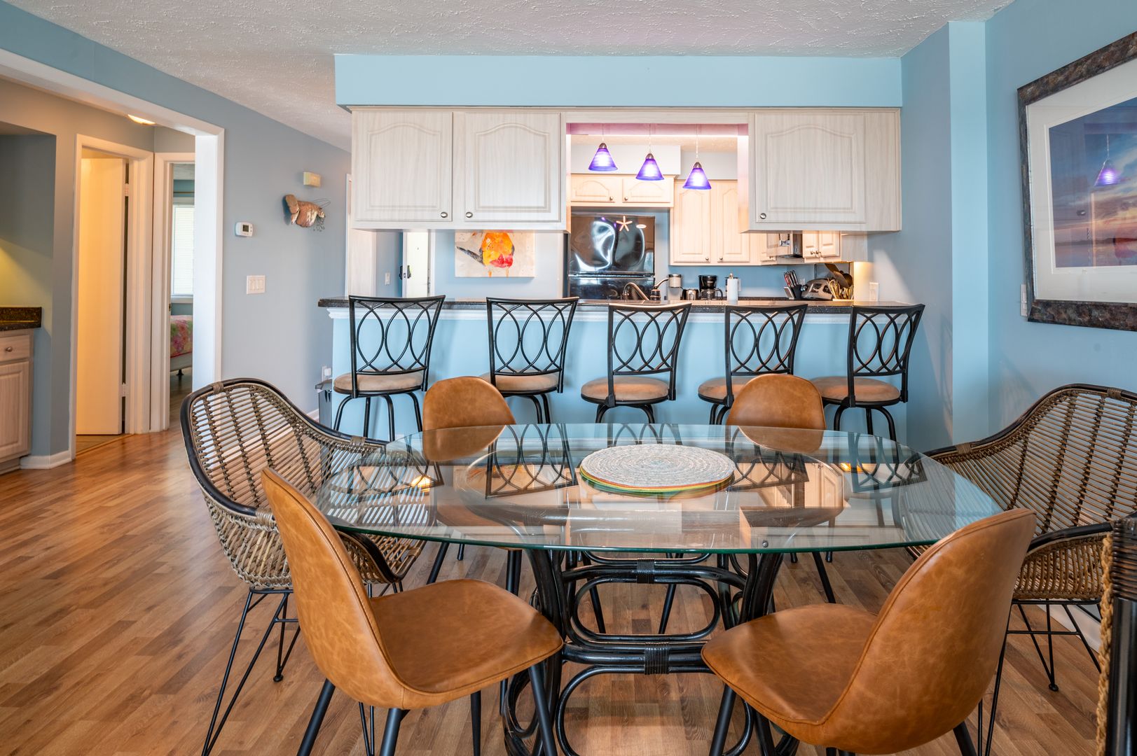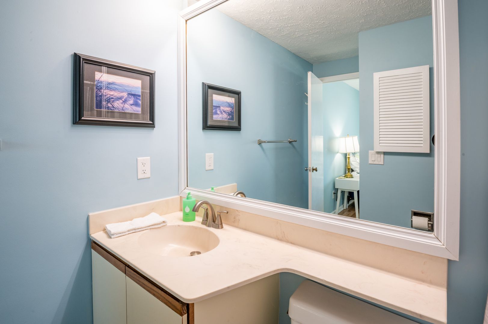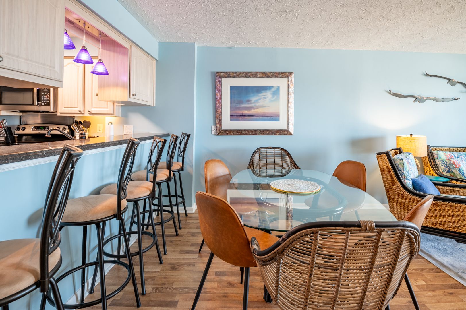 Connect intimately with the ocean from either your living room or primary bedroom suite. The Sandbox is the true meaning of oceanfront, with sweeping views from the windows and oceanfront balconies that have you hanging out over the beach! Our first-floor condo with elevator hovers over the spectacular Coquina Rock formations of Kure Beach fame. Hemingway-style home furnishings are immersed in a fresh, bright, spa-toned interior for a unique, sophisticated vacation cocoon. Embrace the luxury of original art, plush area rugs, and tasteful appointments and you will be sure to have the vacation memories are made of.