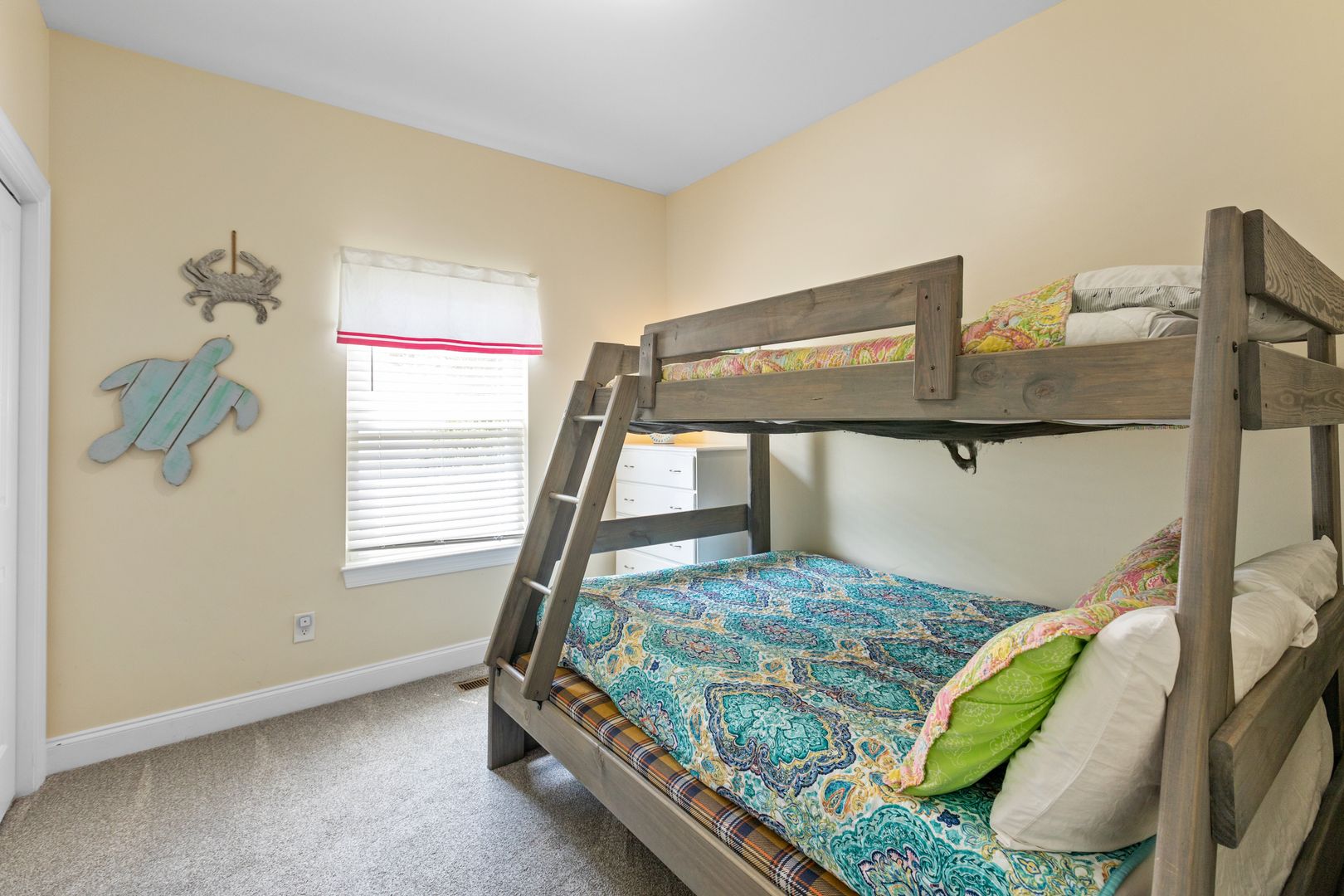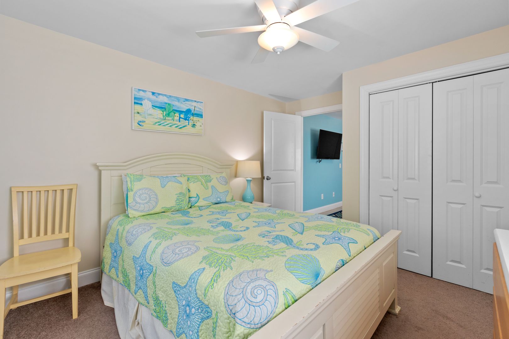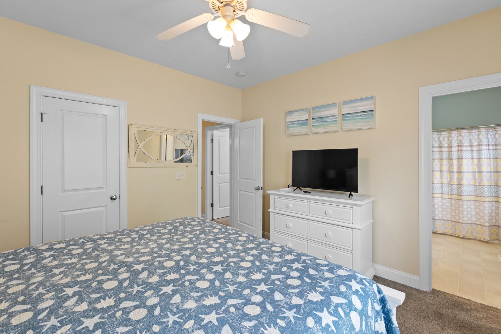 Ground Level will give you the driveway on the left and the side yard drive to accommodate 4 cars. Extra storage garage big enough for a golf cart, with an extra refrigerator for your cold drinks. Multiple Bikes for guests to share. Living area with Roku TV and two guest bedrooms with queen beds and a full bath with a walk-in shower.