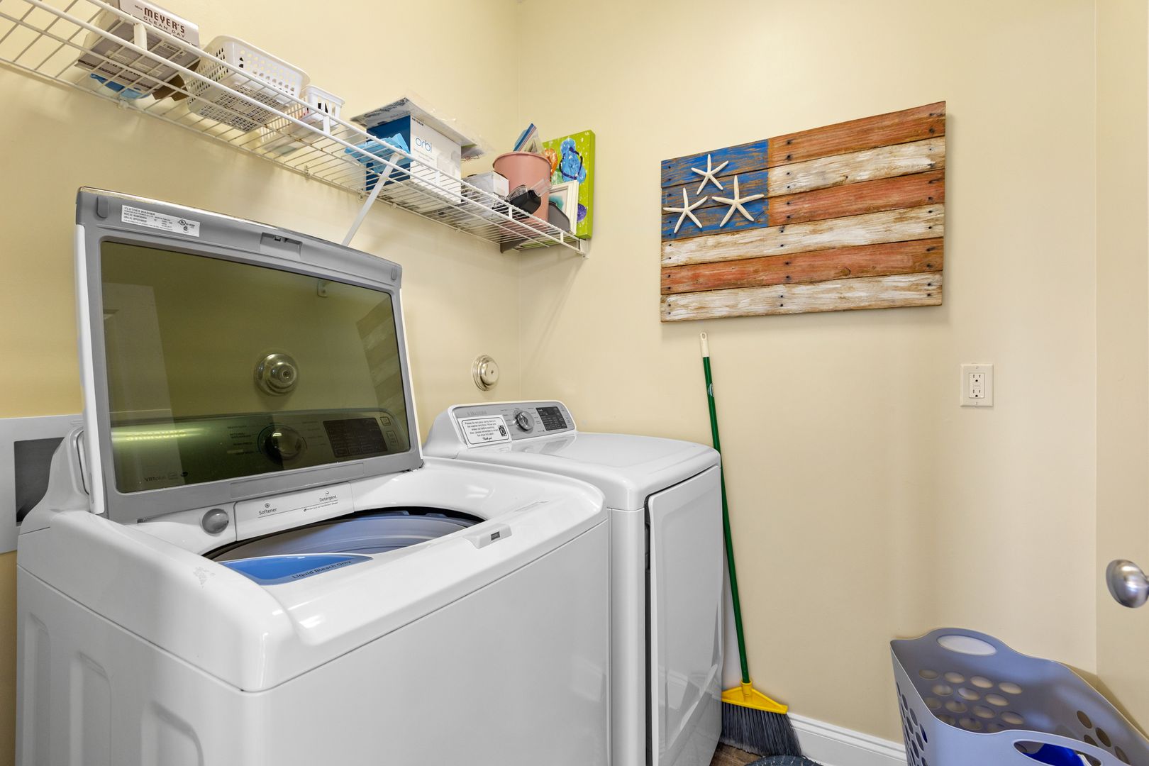 The primary bedroom has a king-size bed, a walk-in closet, and an ensuite bathroom. You will also find the laundry room on this level for your convenience. Two more bedrooms are available on this level.