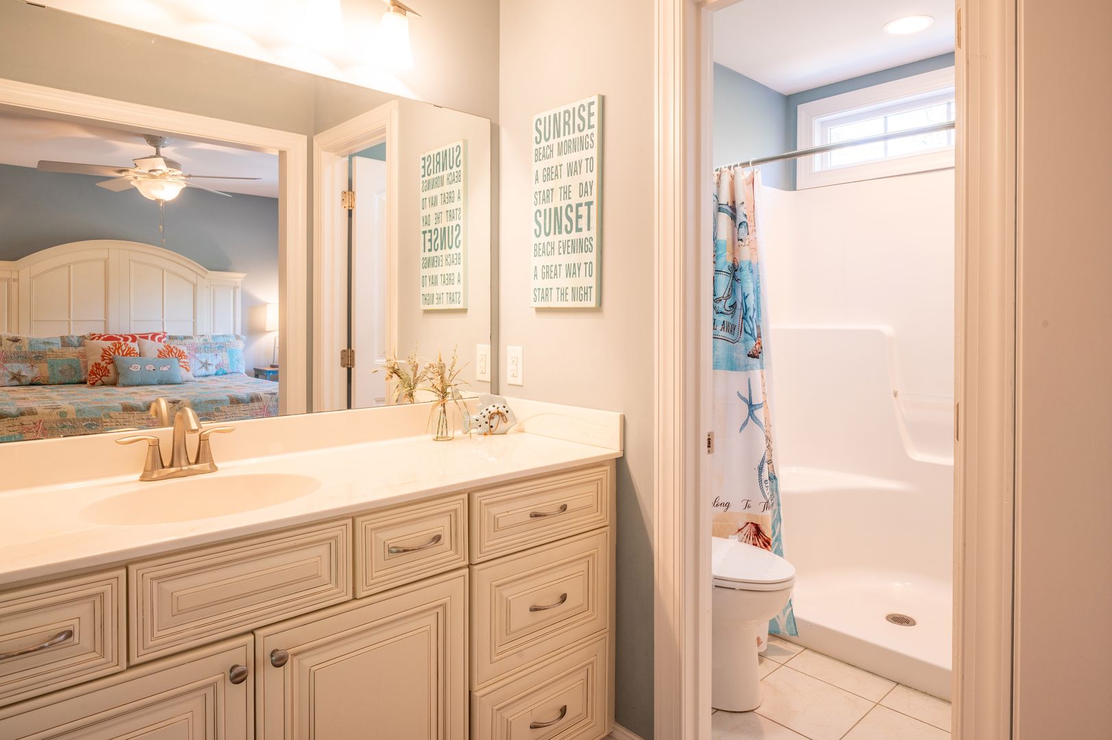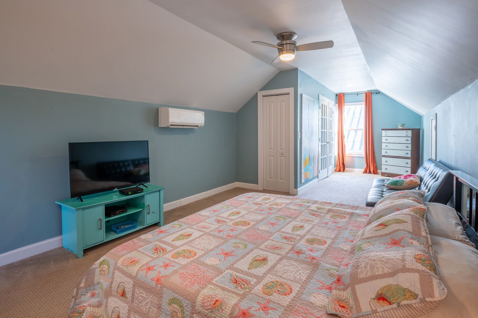 The loft dorm-style bedroom upstairs is perfect for guests to tuck away with a bathroom on that level.