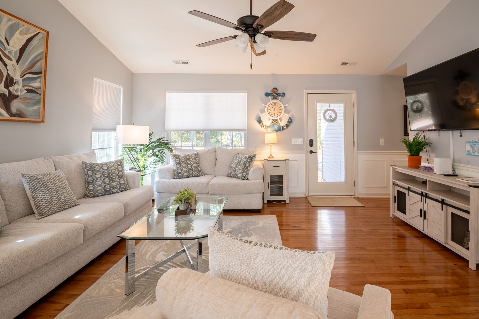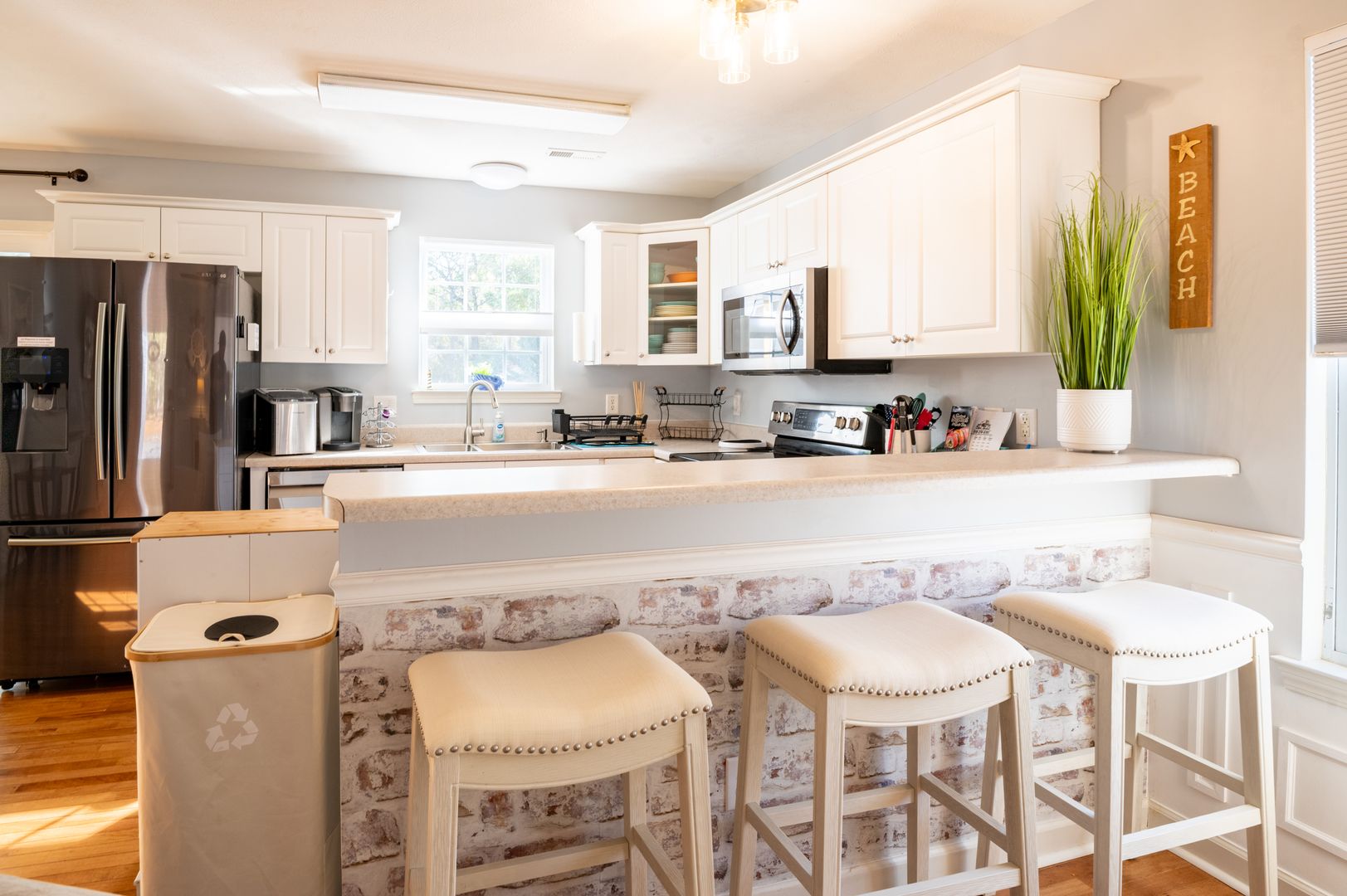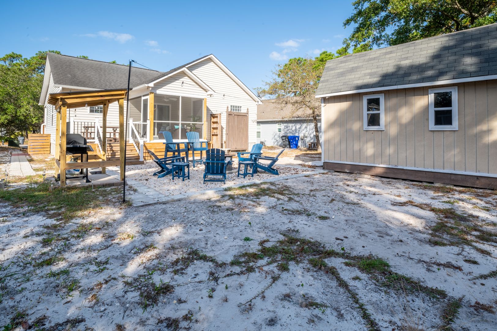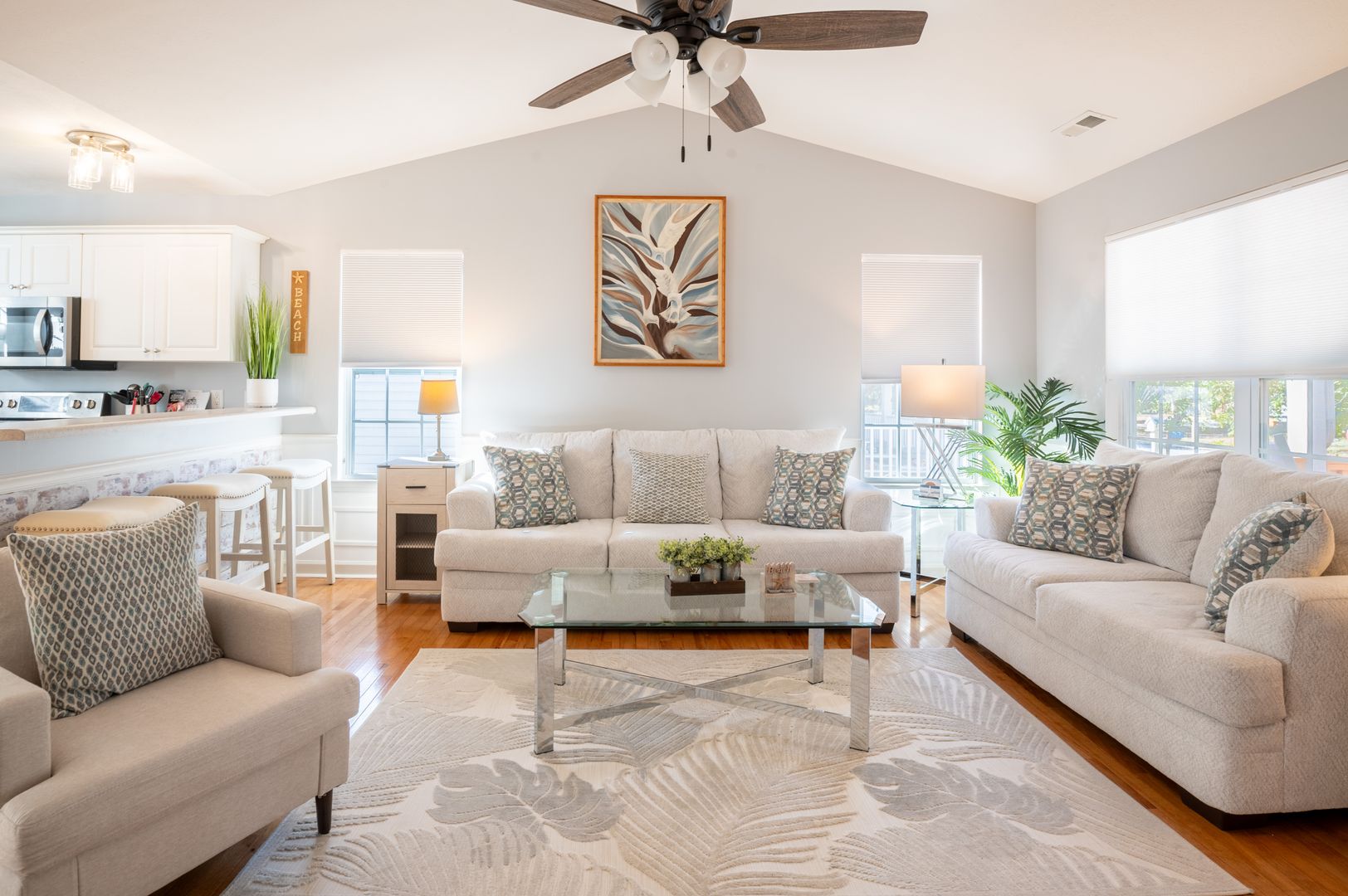 This modern farmhouse decorated home features 3 bedrooms and 2 bathrooms, fully furnished with all the comforts of home. The fully stocked kitchen and propane grill make cooking a breeze, while the washer/dryer and outdoor hot shower add convenience to your stay.