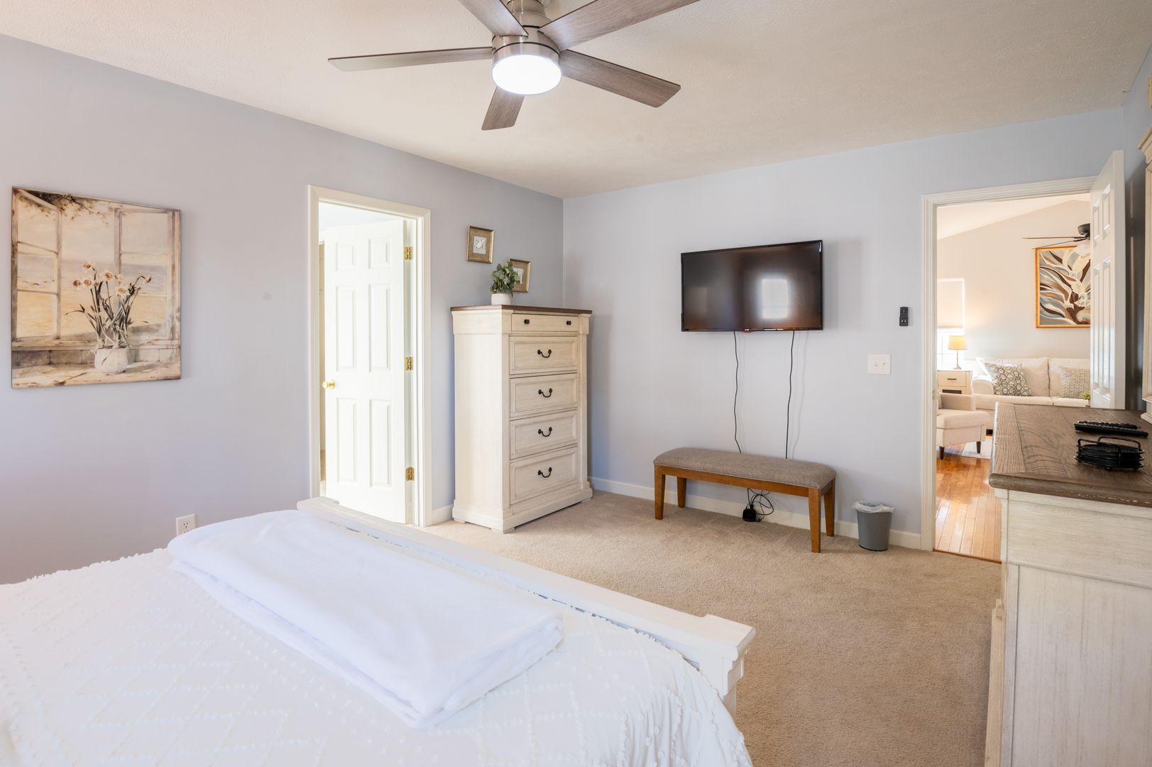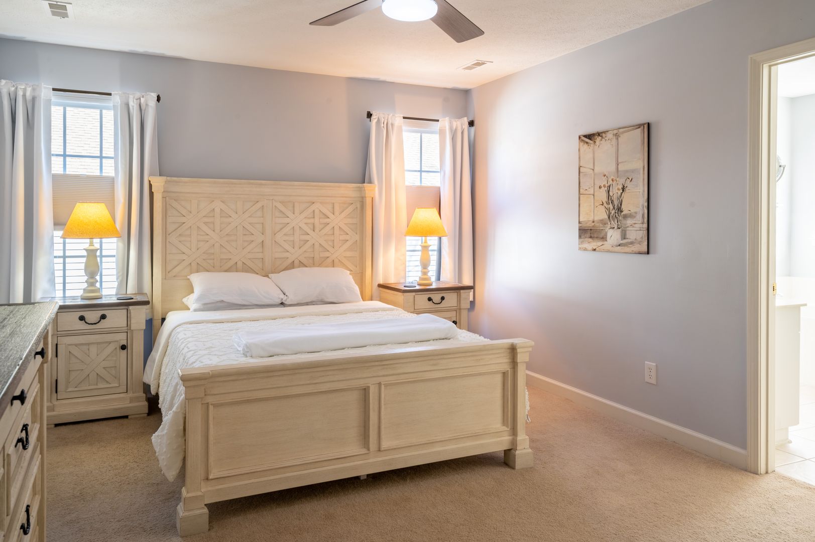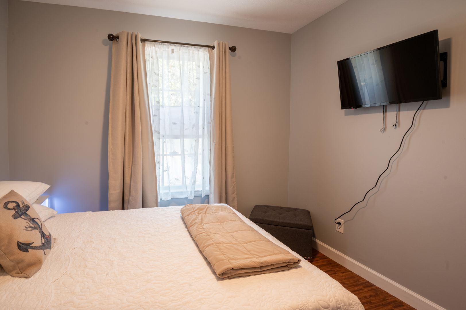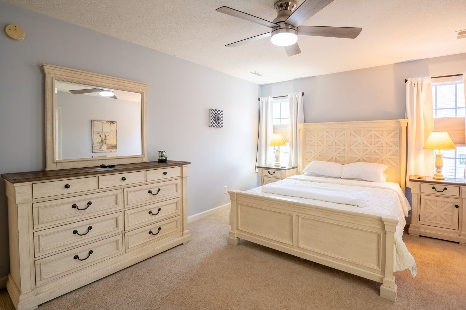 This modern farmhouse decorated home features 3 bedrooms and 2 bathrooms, fully furnished with all the comforts of home. The fully stocked kitchen and propane grill make cooking a breeze, while the washer/dryer and outdoor hot shower add convenience to your stay.