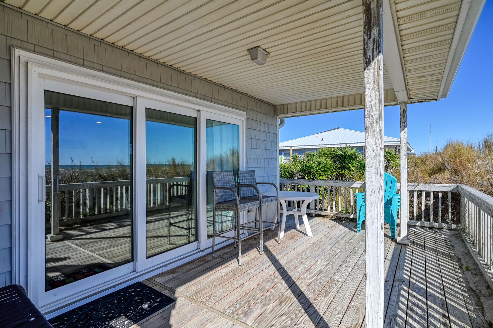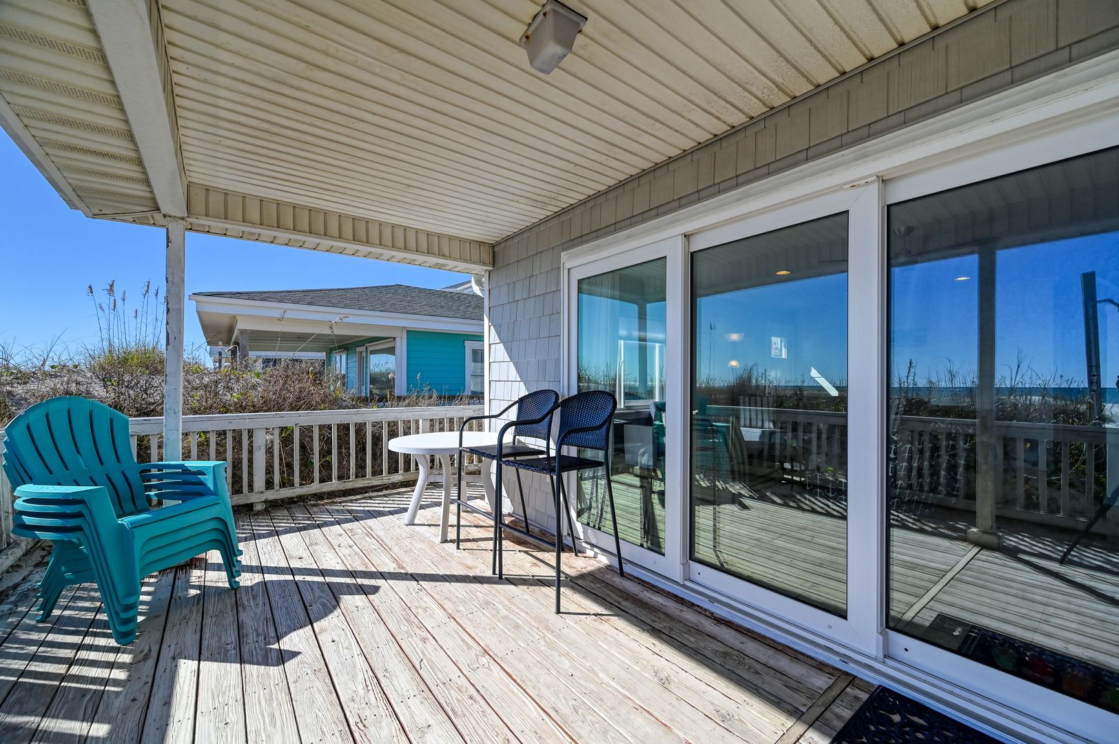 * Oceanfront porch with dining table and lounge chairs