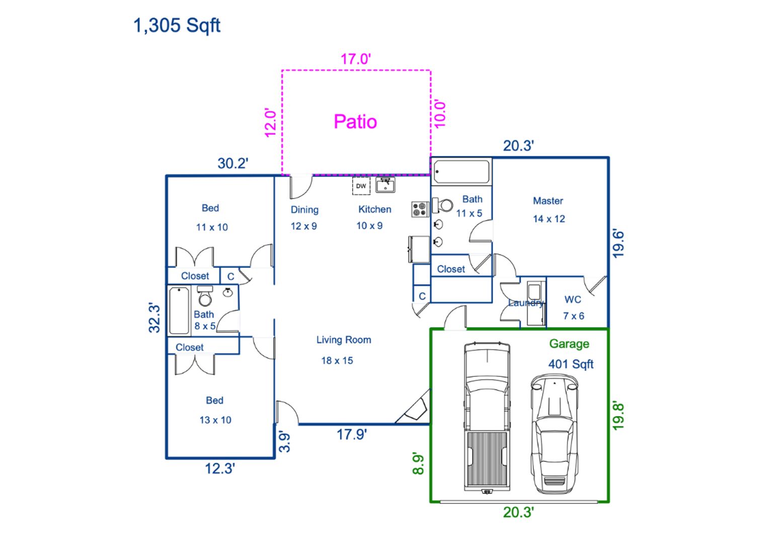 The front entrance takes you into the spacious living room which opens up to the dining and kitchen area. The master bedroom is to the right side of the living room/home as is the laundry area and garage. The master bedroom provides a walk in closet and an en suite bathroom with dual vanities and tub/shower combo. The two spare bedrooms along with a full bathroom and linen closet are located on the opposite side of the house.