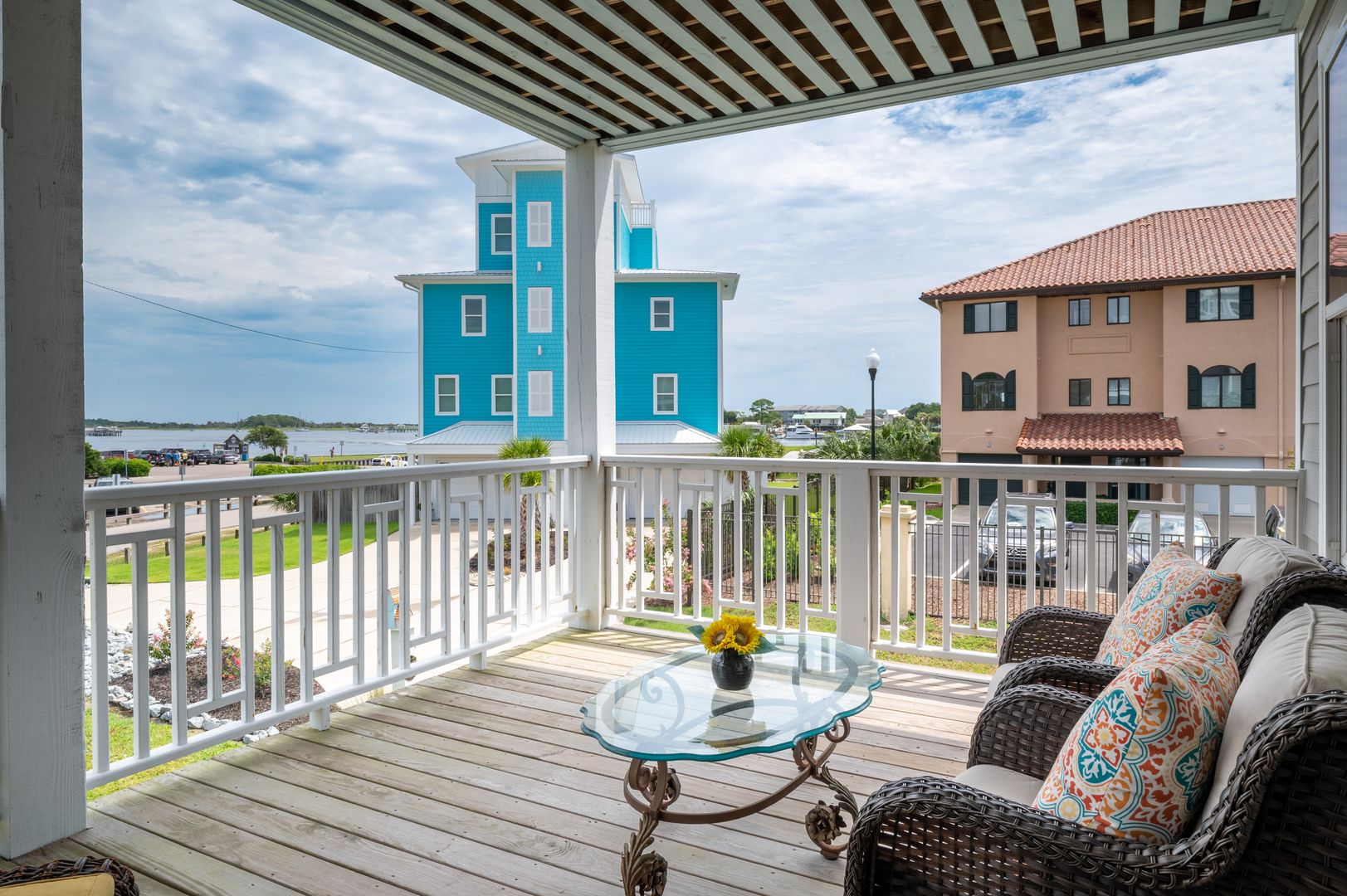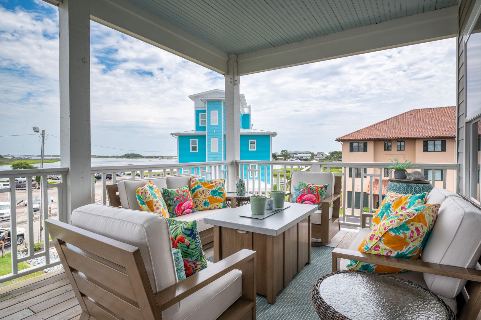 The top level has a large, open bonus room in a cupola. This space can be a fourth bedroom, or a dancing, singing art room for the grand kids. A pub table vignette is great for cards and games, a comfy sofa / love seat and 2 side chairs for reading, and an extra queen futon is provided in case of extra overnight company. A half bath services this level. Walk out on the deck for stunning views of the Intracoastal Waterway, the Carolina Beach Canal, and the Wildlife Boat Ramp.