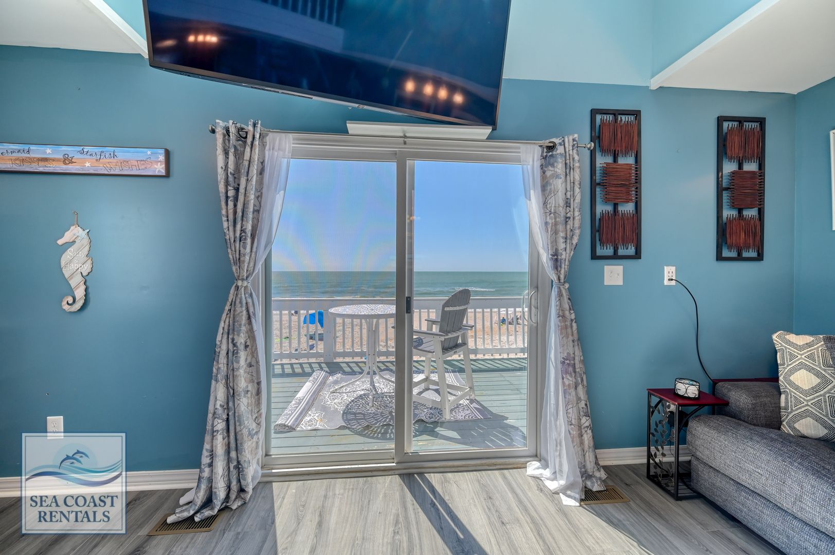 The second floor is where you’ll spend most of your inside time. The comfortable sectional couch with its view of the ocean and large screen mounted TV is the perfect place to gather to watch a movie or just reconnect. There is a sweet reading nook with a bookcase full of great beach reads. Off the living room, you can enjoy the oceanfront deck with tables and chairs. The dining room table seats 6, and the kitchen is well equipped for making dinner. There is a convenient half bath on the second floor. The top floor loft has 2 queen beds and a mounted TV. All the comforts of home, placed directly on the oceanfront. Sea Whoa Paradise leaves nothing left to be desired, making your beach getaway truly magical.