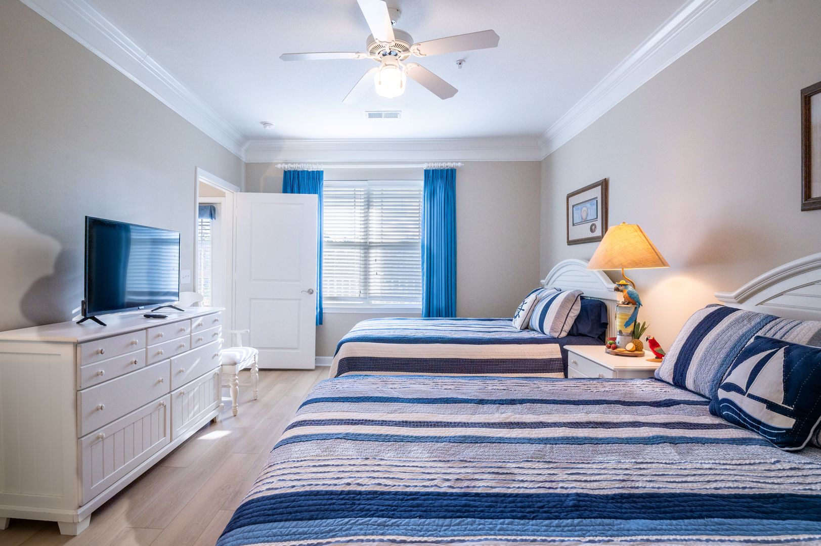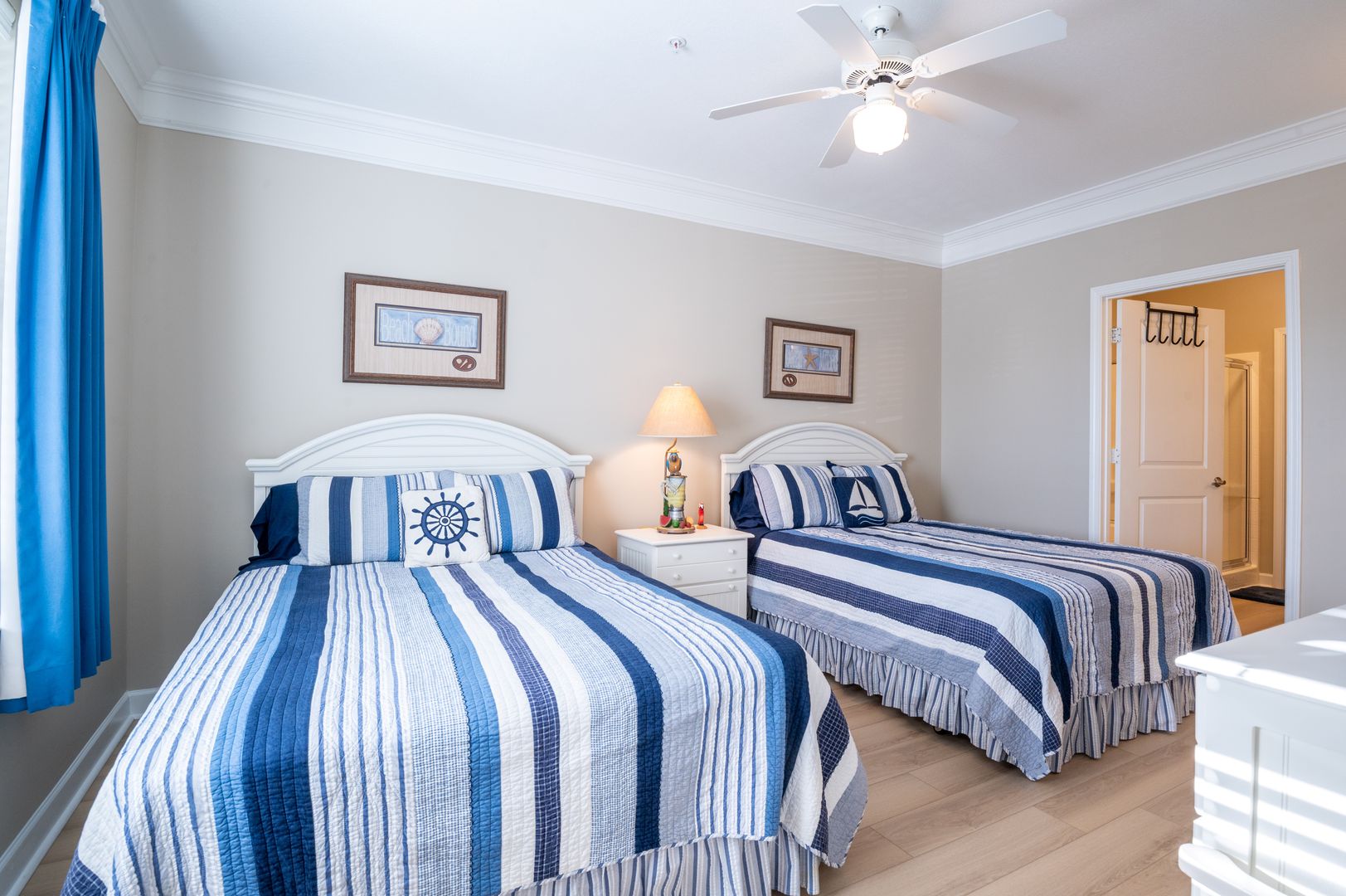 Our primary bedroom has 2 queen beds, with an ensuite bathroom. Enjoy the garden tub for total relaxation. The guest bedroom has one queen, along with a desk if you need to "work from home" and a double closet for your convenience.