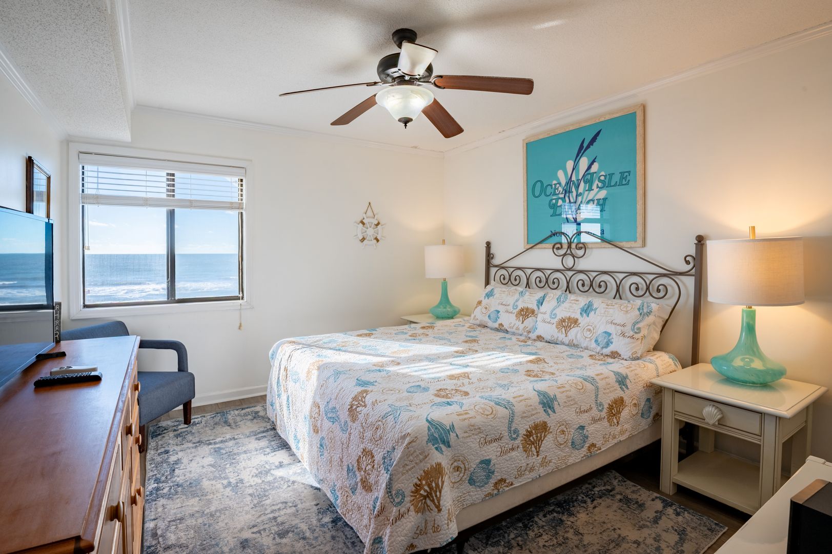 Retreat to one of two cozy bedrooms after a day of soaking up the salt air and sun, each with an attached bathroom. Your primary bedroom has a king bed, a Roku TV, and a window facing the oceanfront. Who needs a noise machine to fall asleep when you have the natural sound right out your window!
