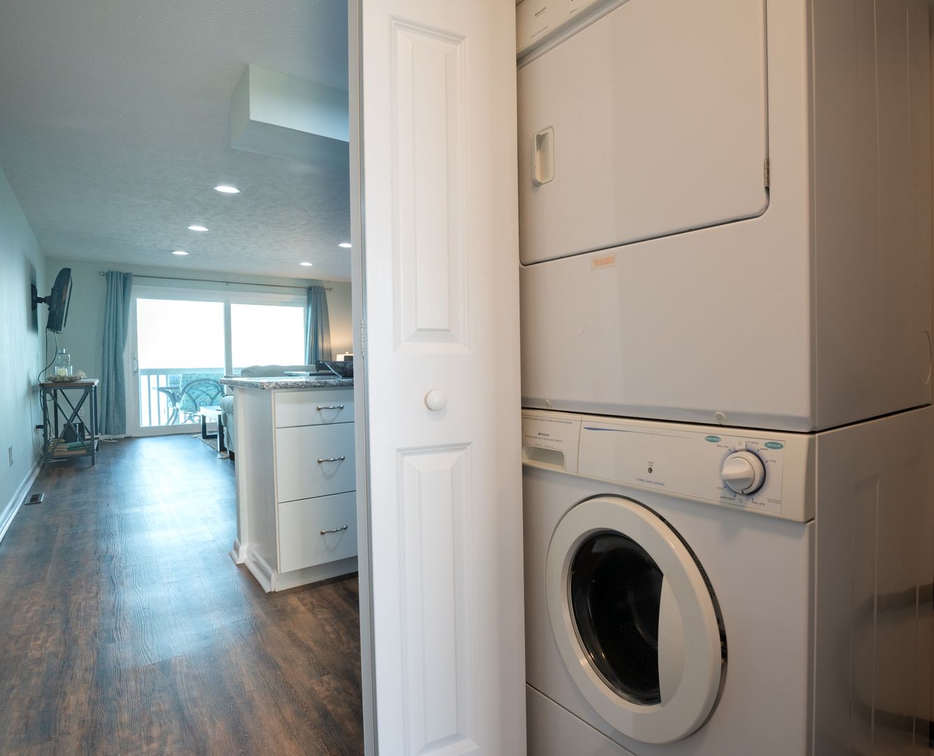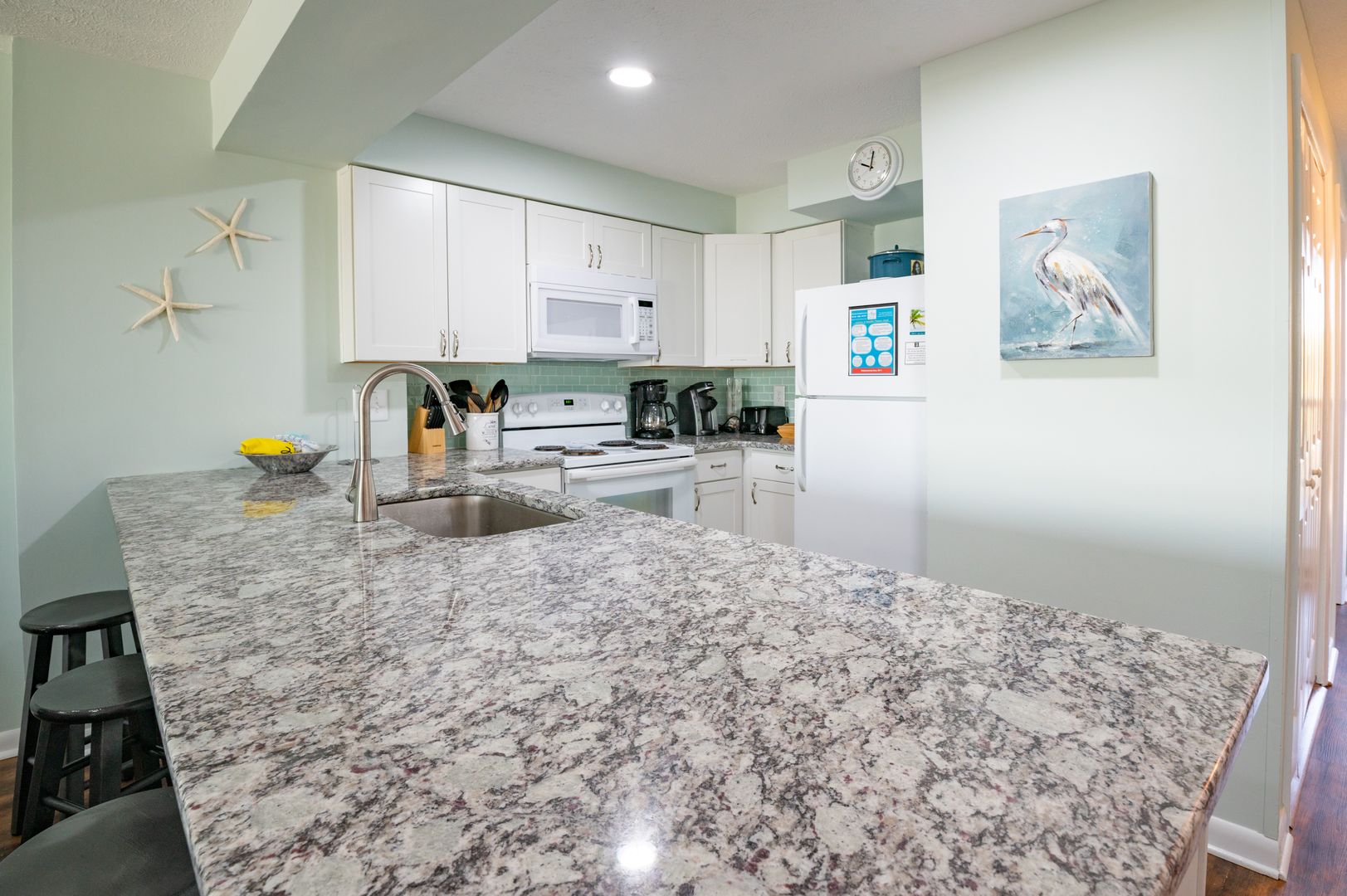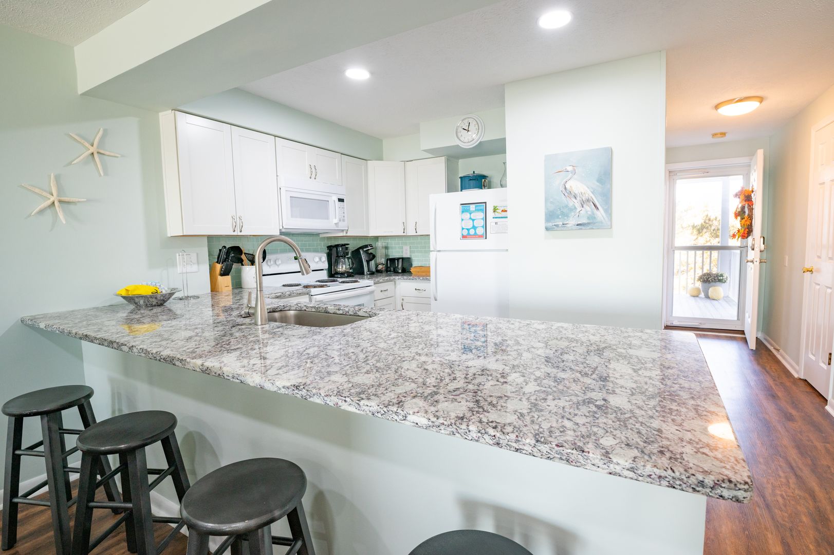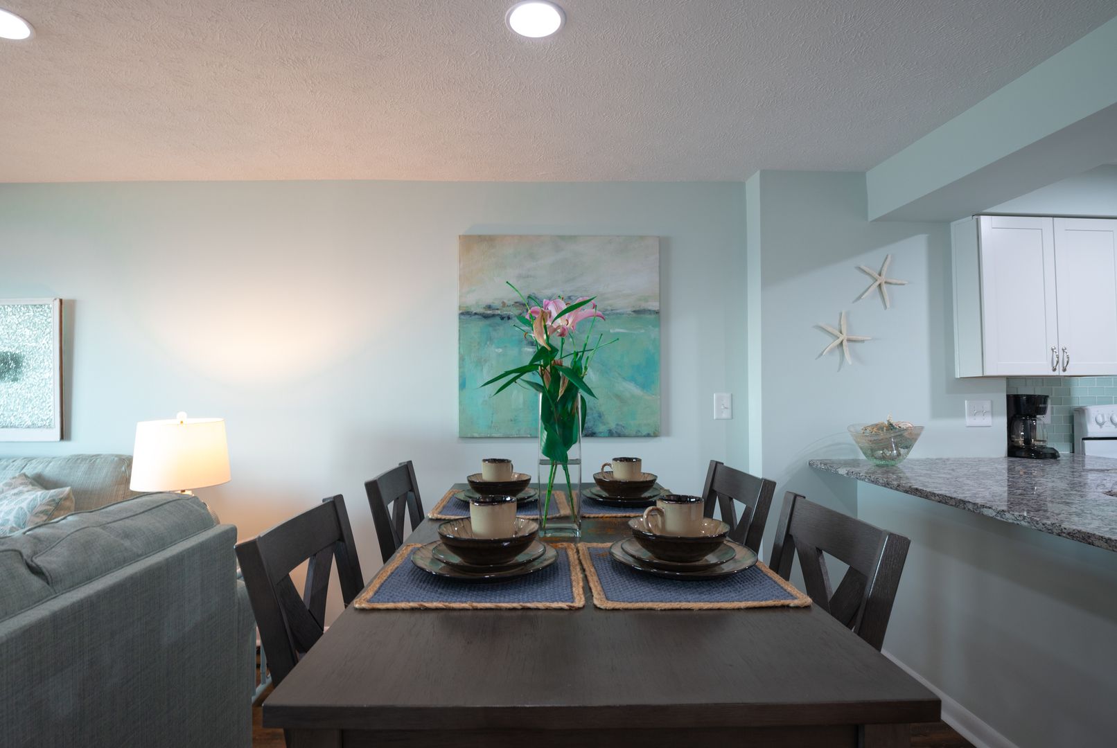 Enjoy the granite countertops with upgraded fixtures and lights. Dining area and living room with deck access to your sea side escape.