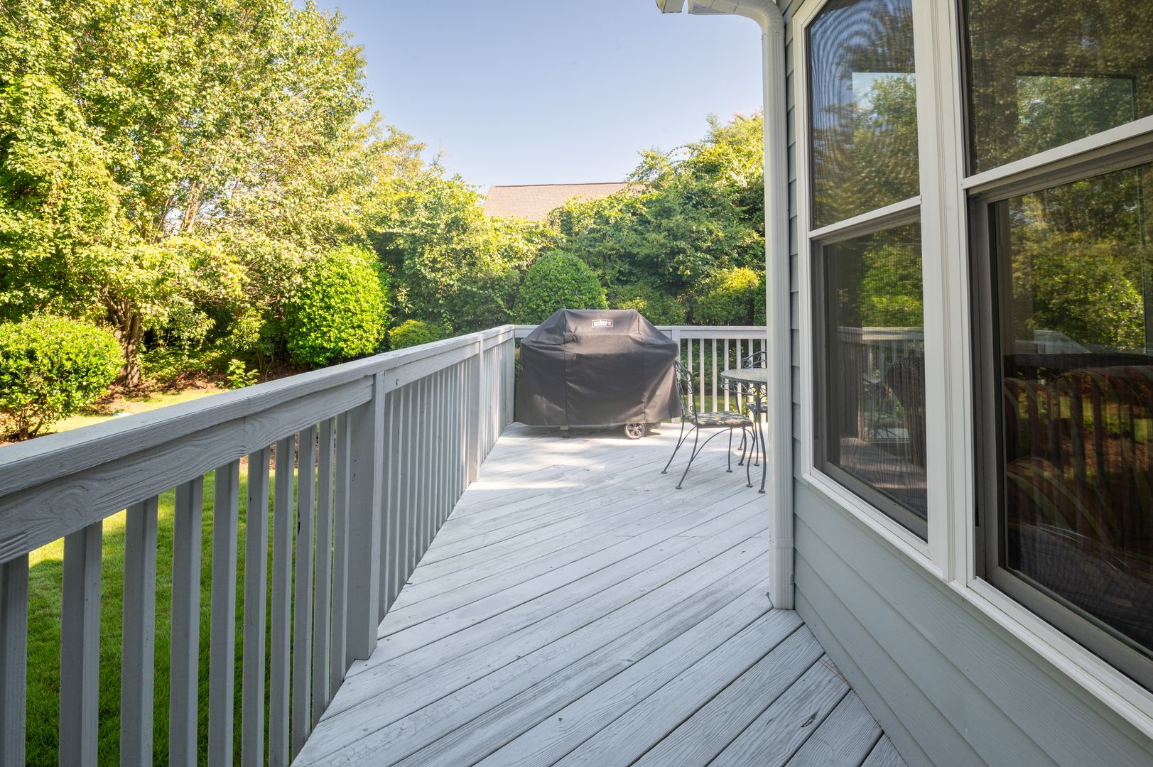 A backyard deck overlooks a beautifully landscaped grassy backyard.