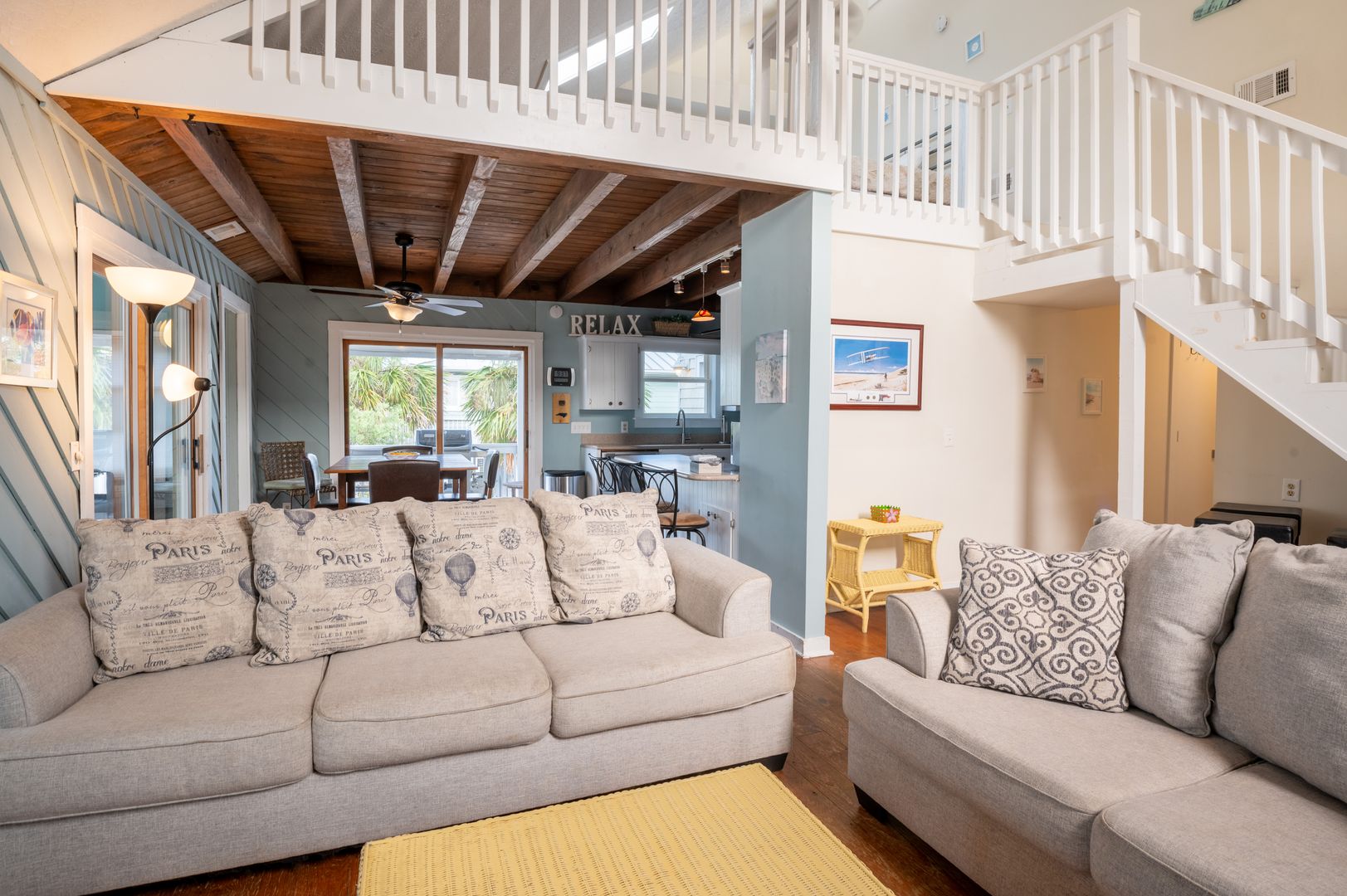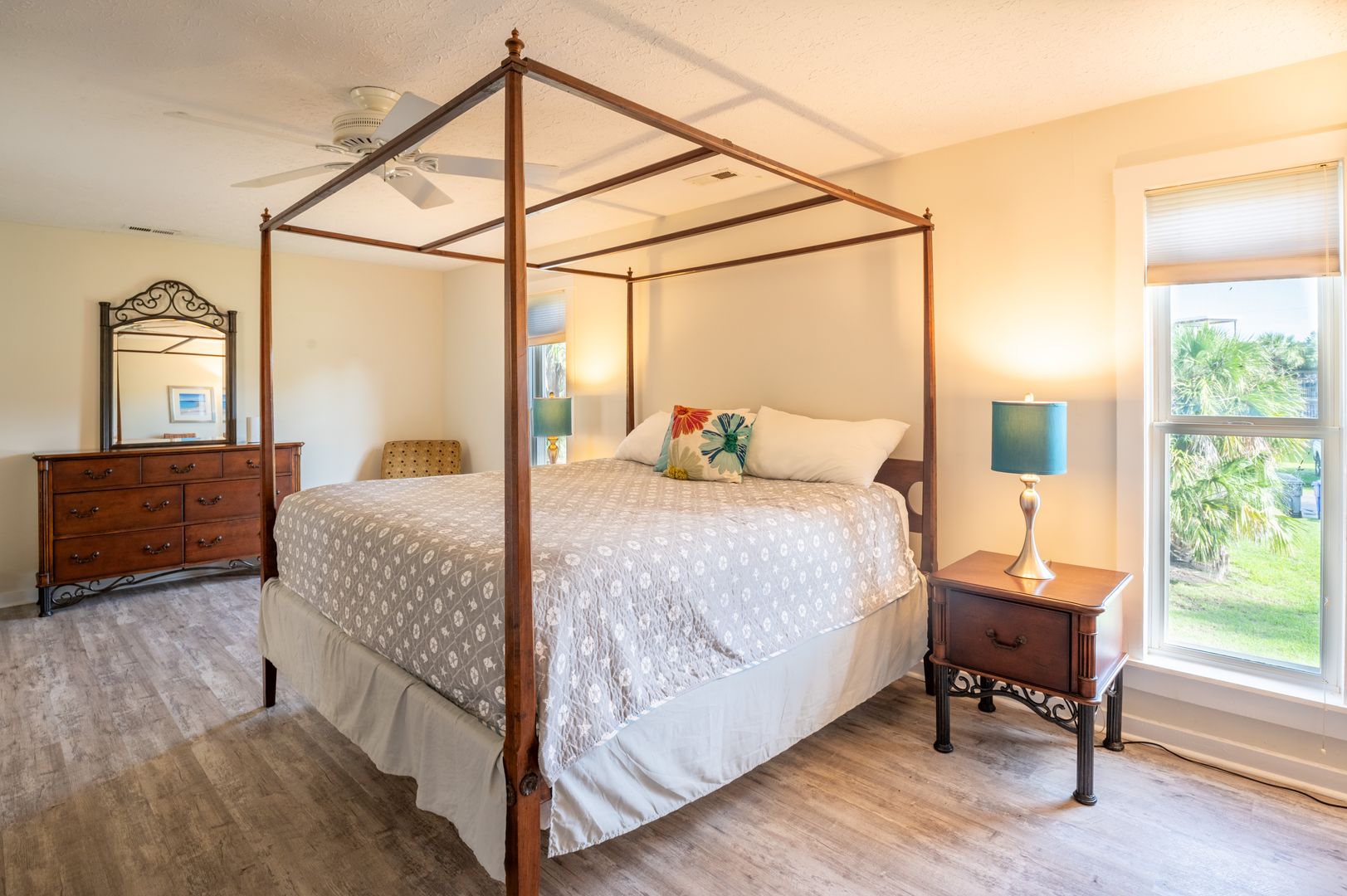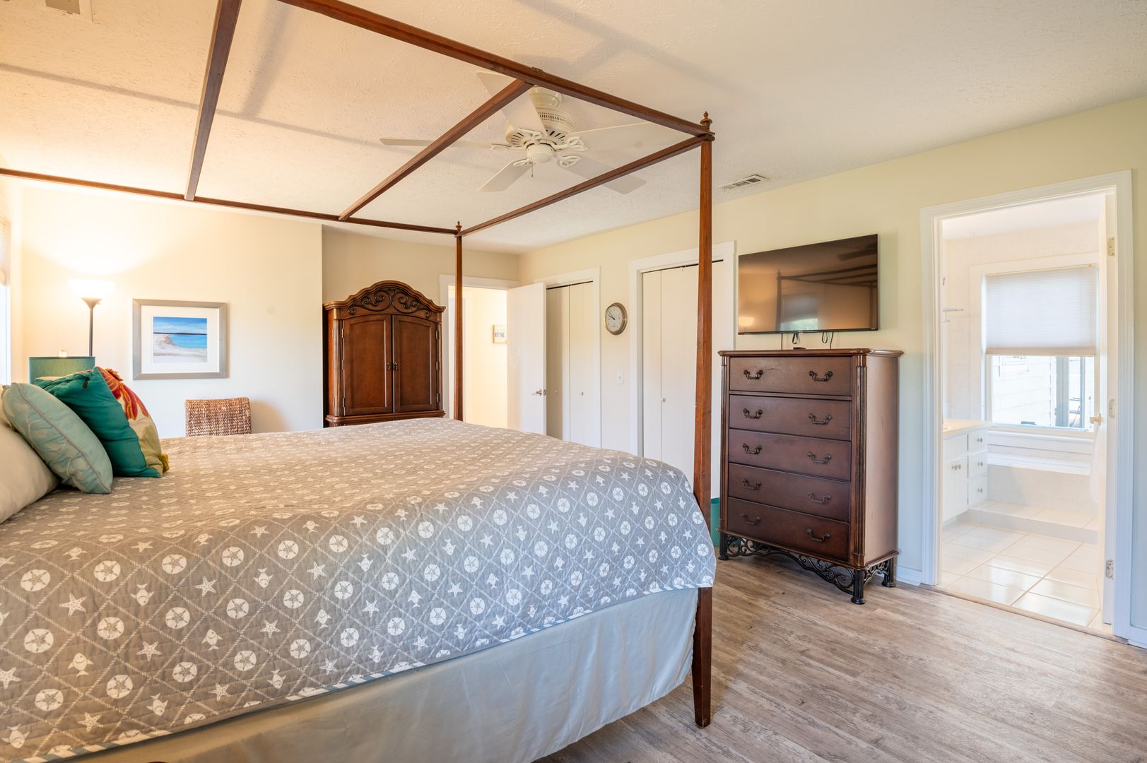 The master suite is spacious with a 4-poster king-size bed and a double-wide closet for your convenience. Your second bedroom has a queen-size bed, while the loft bedroom offers additional space for guests (also a queen).
