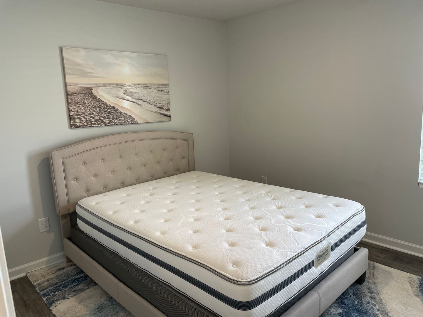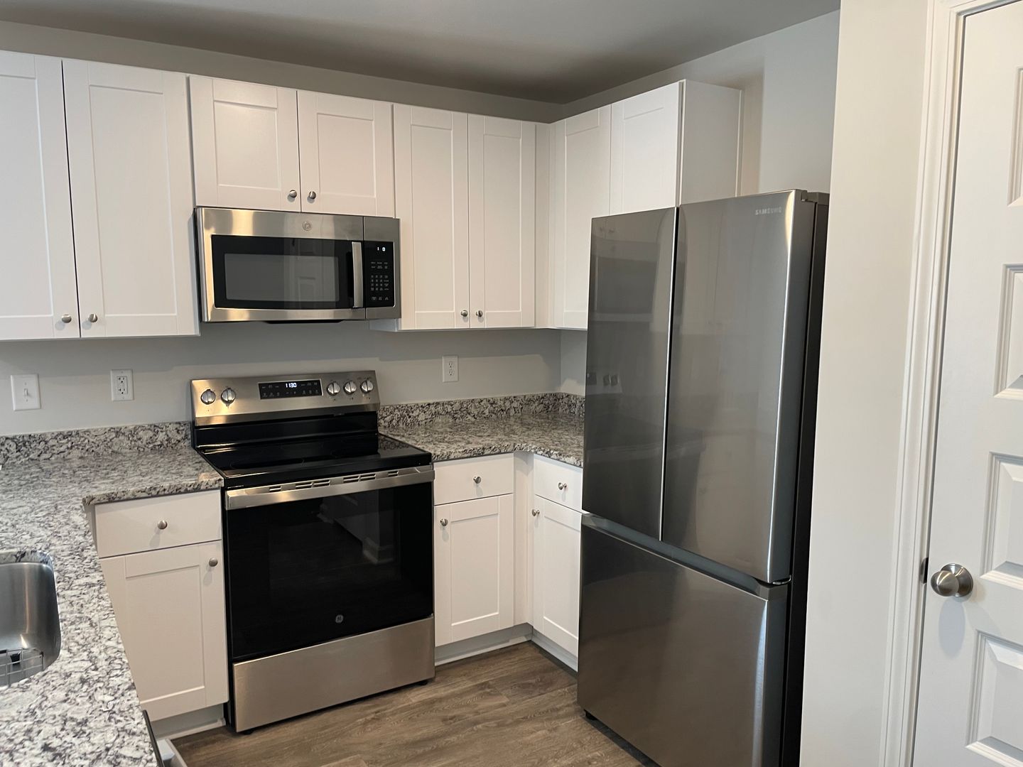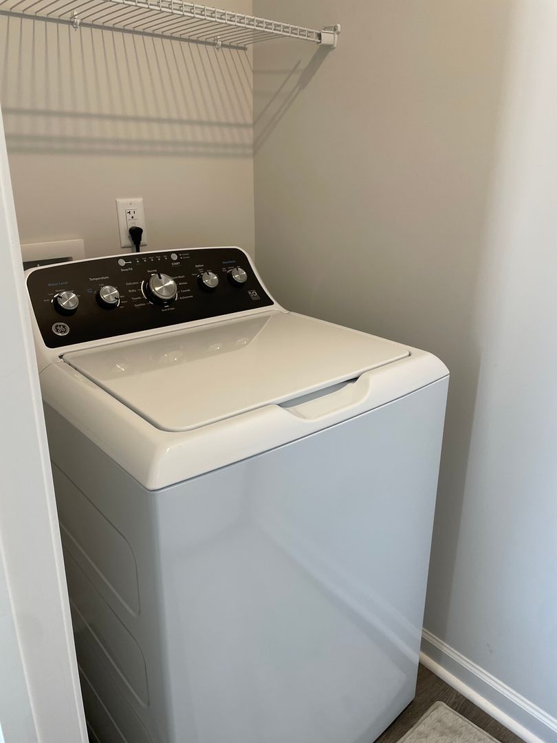 The modern kitchen comes fully equipped with a refrigerator, stove/oven, microwave, and dishwasher. A washer and dryer are also included, ensuring move-in readiness from day one.