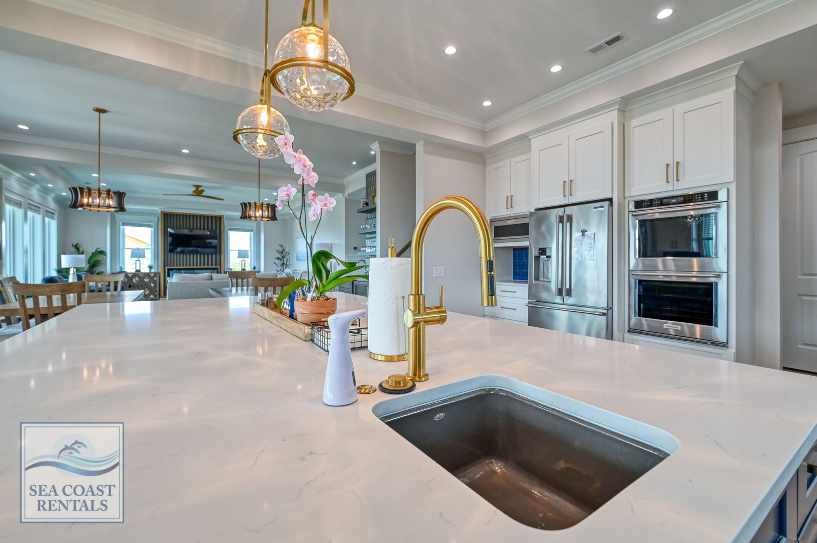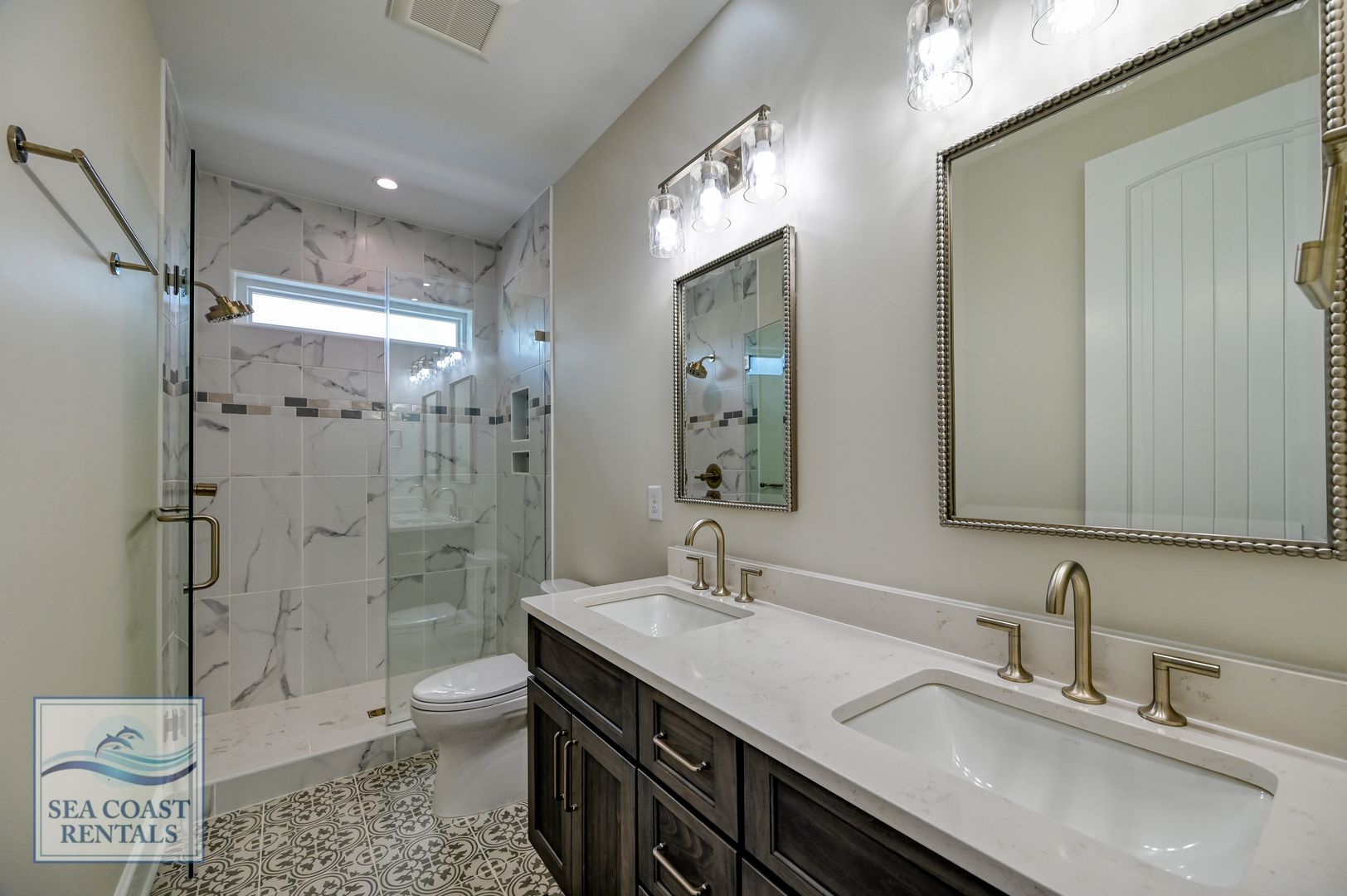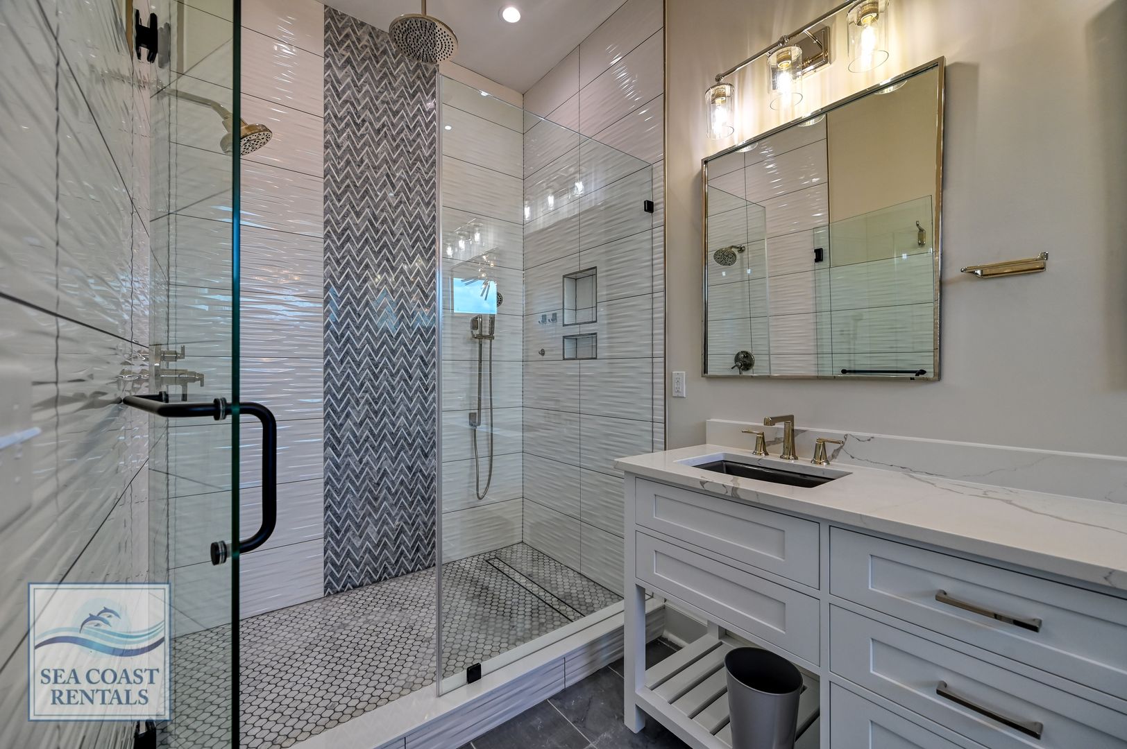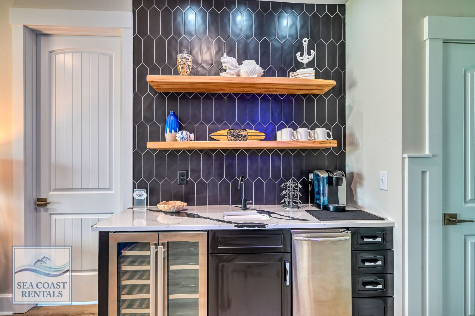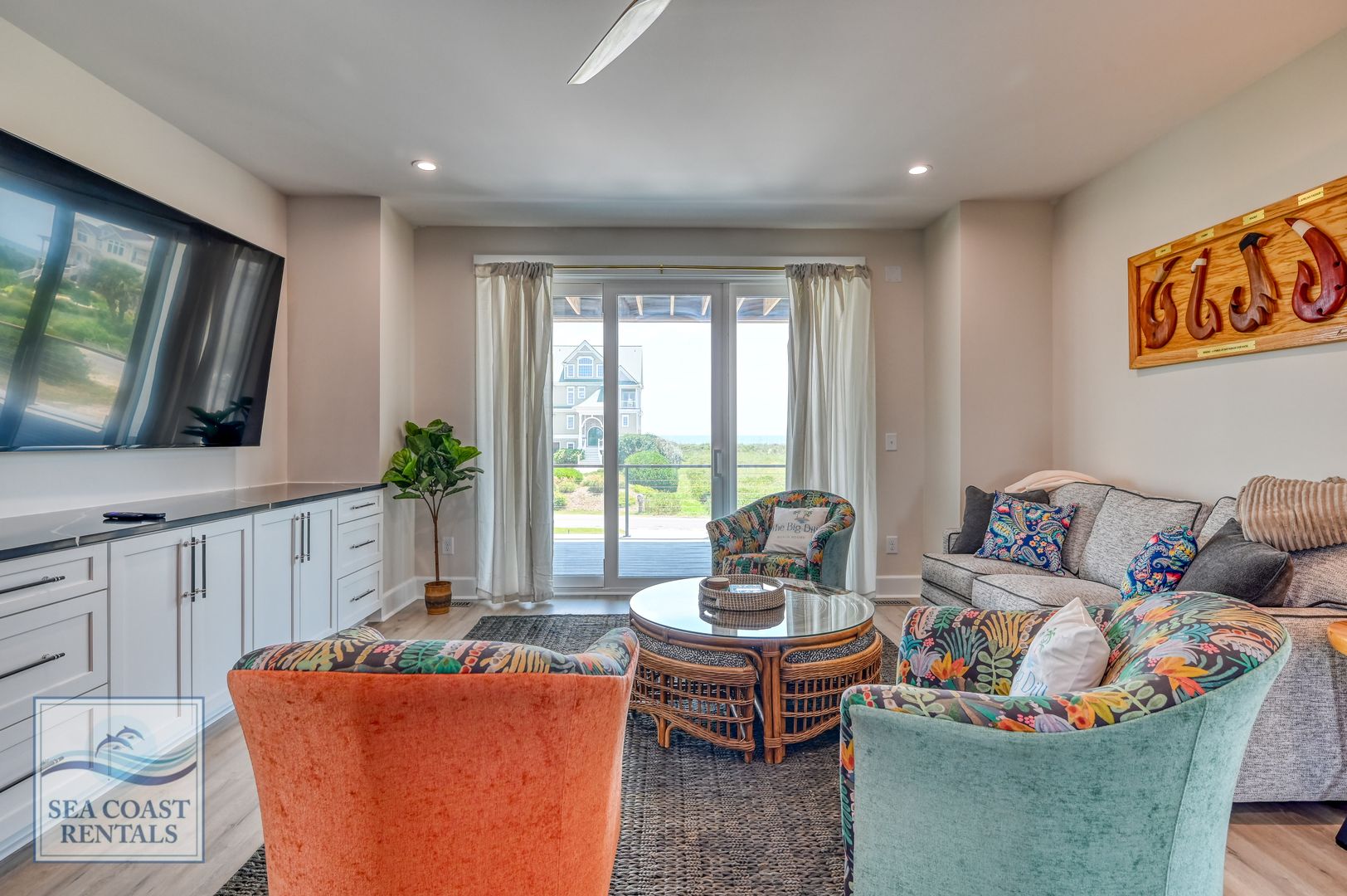 We haven’t even mentioned all the fun you can have both inside and out! Aside from the beautiful beach and ocean, you never have to leave the house to enjoy a fun filled day. There is a 40-foot by 25-foot private pool with a 10-foot tanning deck, a regulation sized Pickleball court, outdoor BBQ grill with prep area, covered outdoor living space with a TV and an outdoor shower. If you prefer to be inside, then you can enjoy the game lounge with an 85-inch smart TV, foosball table, coffee bar, beverage fridge and ice maker that are still steps from the pool.