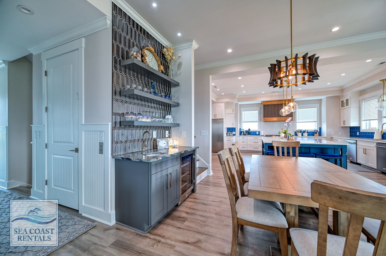Additionally, there’s a wet bar and wine fridge for those fun cocktails at happy hour. Family dining is easy with 2 dining tables that can seat up to 24 plus an outdoor dining area just off the dining room for those who prefer al fresco dining.