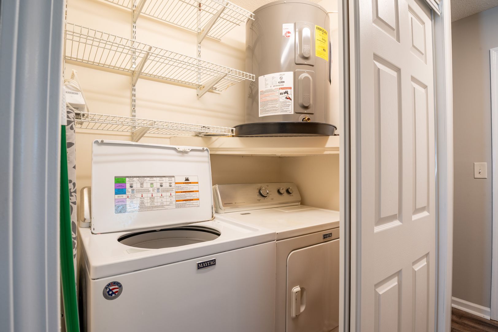 Continuing down the hallway, the master bedroom suite lies to your left at the end of the hallway. It features a king bed and a private ensuite bathroom featuring double vanities and a luxury tile shower. Both bedroom two and bedroom three feature a queen bed in each, lying across the hallway from the master bedroom. Just beyond the bedrooms is the full bathroom located in the hallway. Across the hallway from the bedrooms is a small closet conveniently containing a washer and dryer.